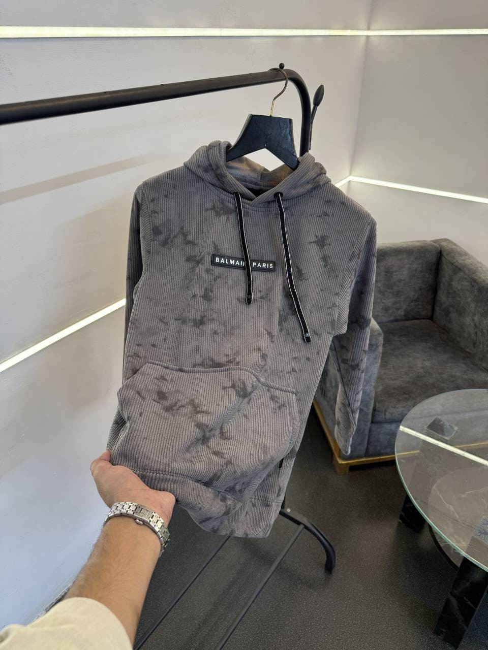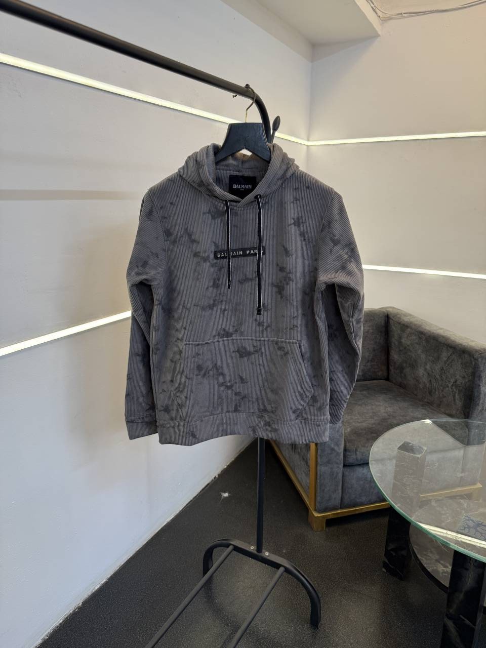 ? *Balmain imported washing cloudy look textured knitted fabric soft feel hoodie with balmain imported pu metal badge on chest front now in stock*?
