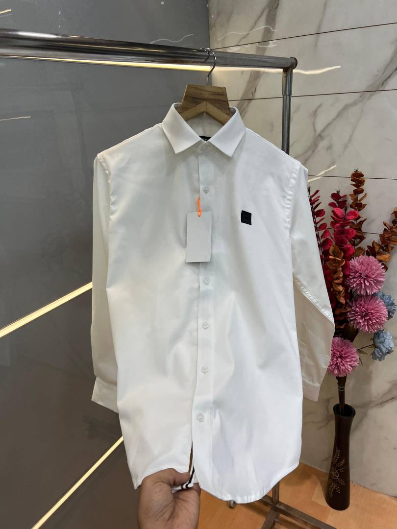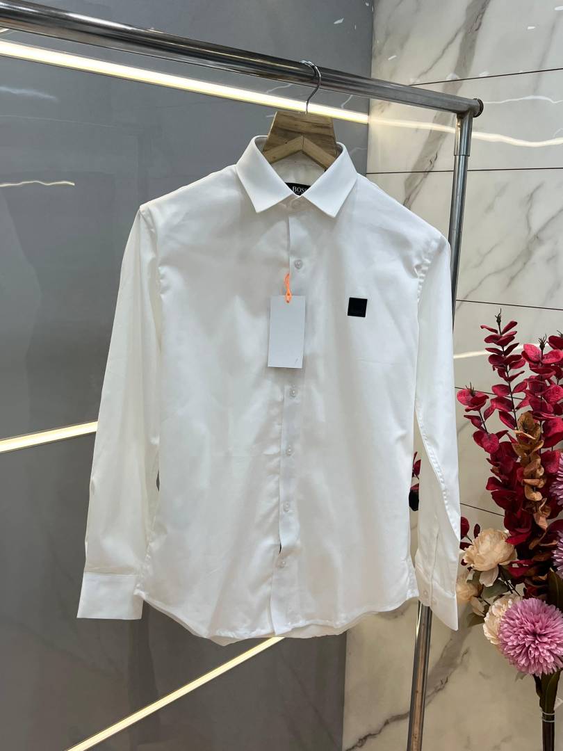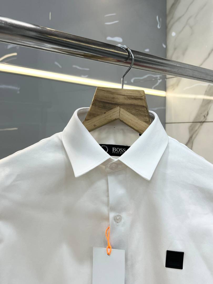 Hugo Bos s White Premium Imported Cotton Lycra Fabric Patch Logo Shirt with custom Branded Button Tagging And Brand Packing 3873